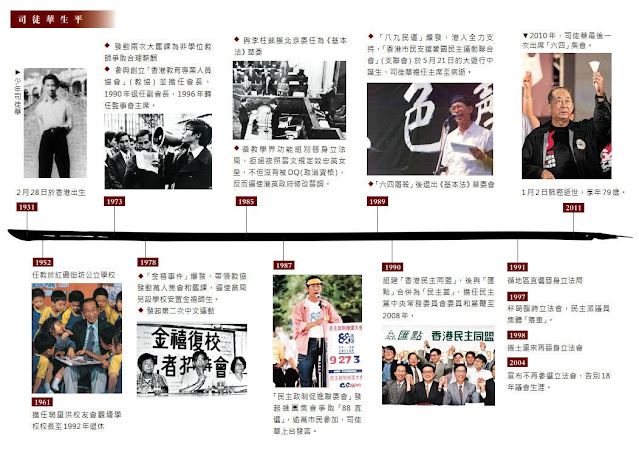 1989 「香港市民支援愛國民主運動聯合會」(支聯會)於5月21日的大遊行中誕生,司徒華擔任主席至病逝;「六四屠殺」後退出《基本法》草委會